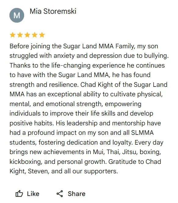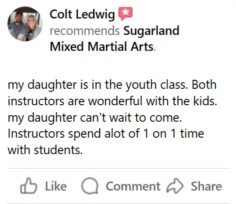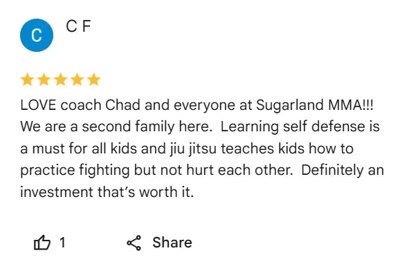 We don’t require parents to stay during classes. However, we do find that parents who get involved with their kids Brazilian Jiu-Jitsu lessons truly build a solid connection. They see their child grow in confidence and skill as they progress through their belt ranks. Building strong family units is important to us at Sugar Land Mixed Martial Arts for our Sugar Land community.
